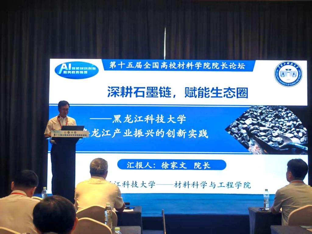 分论坛重点围绕党建思政、AI赋能人才培养、学科与师资队伍建设、科研平台建设、区域发展、期刊与国际化等方面,分6个会场进行了广泛交流与研讨,来自全国近70所高校的专家学者作学术报告。beat365官网材料科学与工程学院院长徐家文教授在区域发展分论坛作题为《深耕石墨链,赋能生态圈——黑龙江科技大学服务龙江产业振兴的创新实践》报告。报告介绍了beat365官网围绕黑龙江石墨产业布局,抢抓龙江创新驱动发展战略机遇,助力哈尔滨“碳谷”生态圈建设,围绕“煤炭产业链”和“石墨产业链”着力打造学校创新链的实践,展示了材料科学与工程学院在石墨领域研究中,锚定1个核心产业、依靠2轮协同驱动、构建3级支撑平台、实现4方主体联动的服务石墨产业发展格局,以及在人才培养、技术转让、成果转化等方面取得的成果。