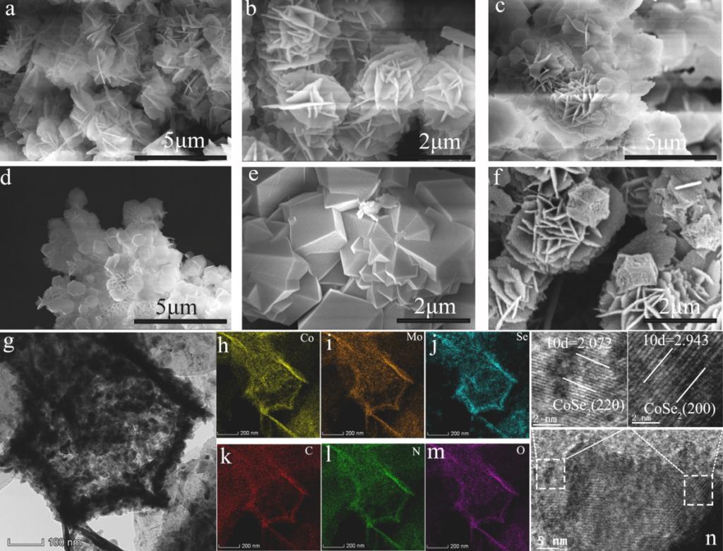 在材料能源催化领域,研究团队创新性地开发了MoSe2/CoSe2分级结构电催化剂。该材料以金属有机框架为前体,通过精确调控硒化过程形成多孔异质结构,在尿素辅助海水电解中表现出卓越的催化活性。实验表明,在模拟海水电解环境中,催化剂驱动10 mA/cm2电流密度仅需1.319 V电压,较传统电解方式能耗降低显著。
