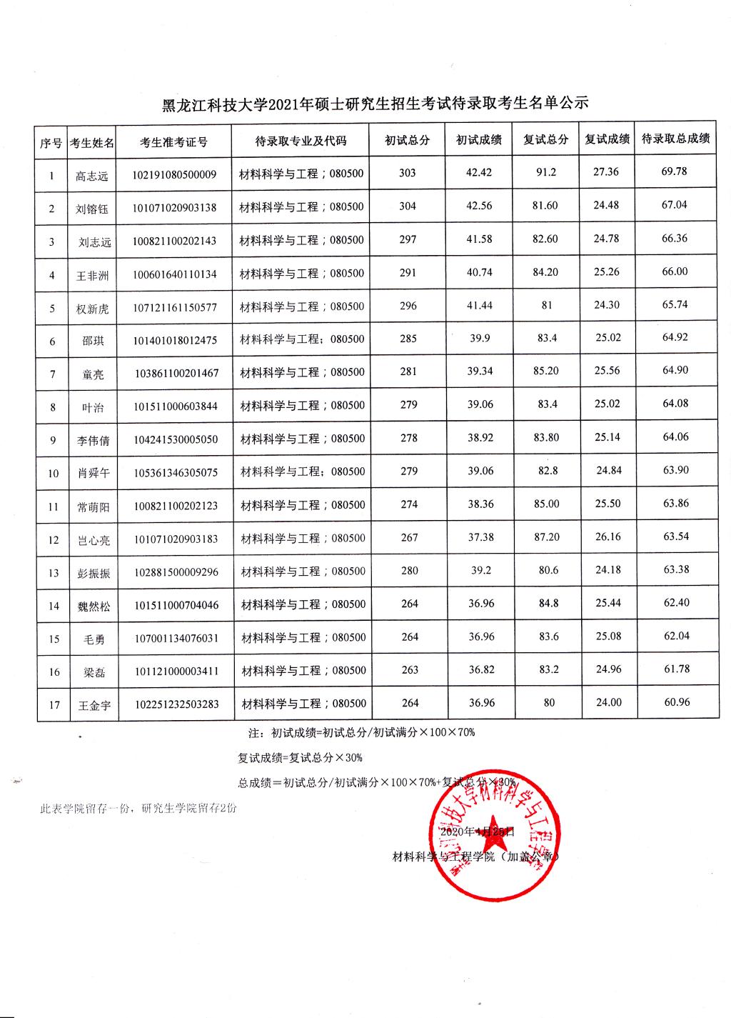 依据《材料科学与工程学院2021年硕士研究生调剂及复试录取工作实施细则》,beat365官网发布了调剂招生信息公告,并在调剂系统开放期间内征集志愿。根据考生初试和复试成绩计算出的最终待录取总成绩,beat365官网择优确定以下17名待录取考生,现将名单公示如下: