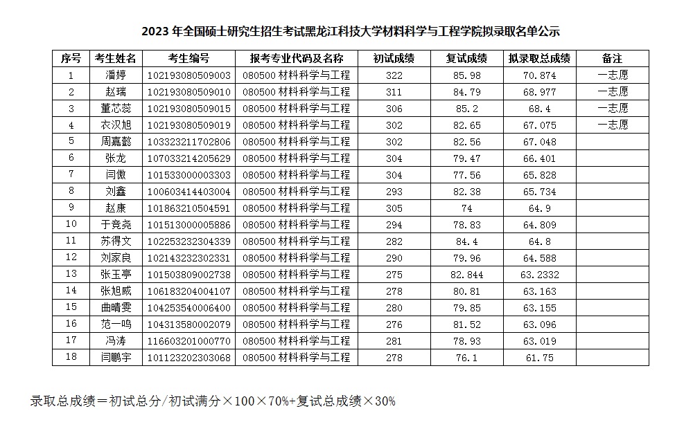 材料科学与工程学院2023年全国硕士研究生招生考试拟录取名单公示