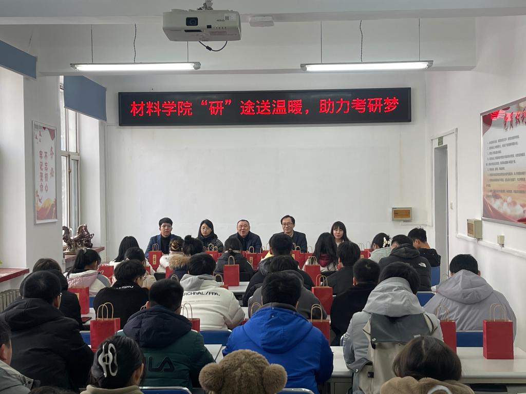 为充分了解考研学生备考情况,鼓励备考学生以饱满的精神状态迎接到即将到来的研究生考试,12月11日中午,材料科学与工程学院组织开展了“‘研’途送温暖,助力考研梦”慰问考研学生活动。学院党委书记张显栋、党委副书记孙亚朋、全体辅导员和52名2020级考研学生参加了活动。活动由学院党委副书记孙亚朋主持。